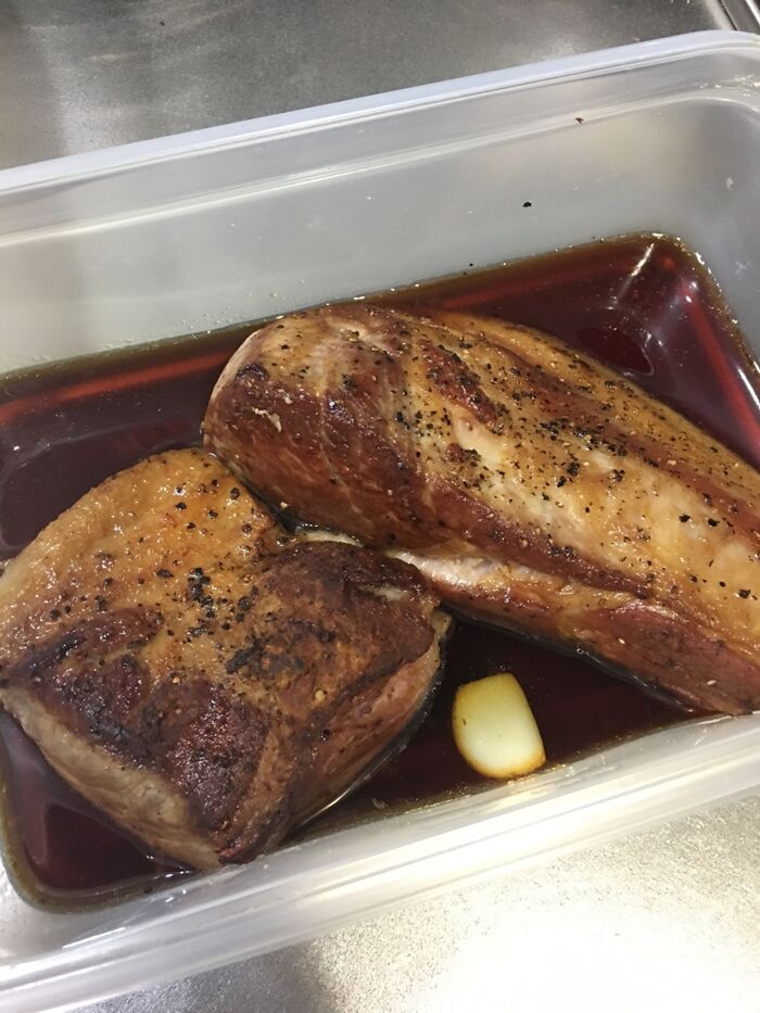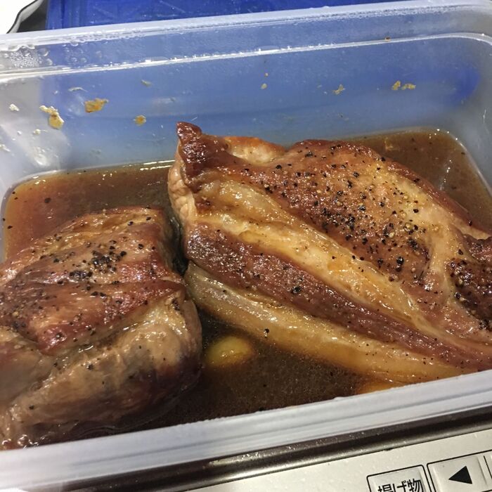 焼き色が付いたら、調味料の入ったジップロックコンテナに入れます。