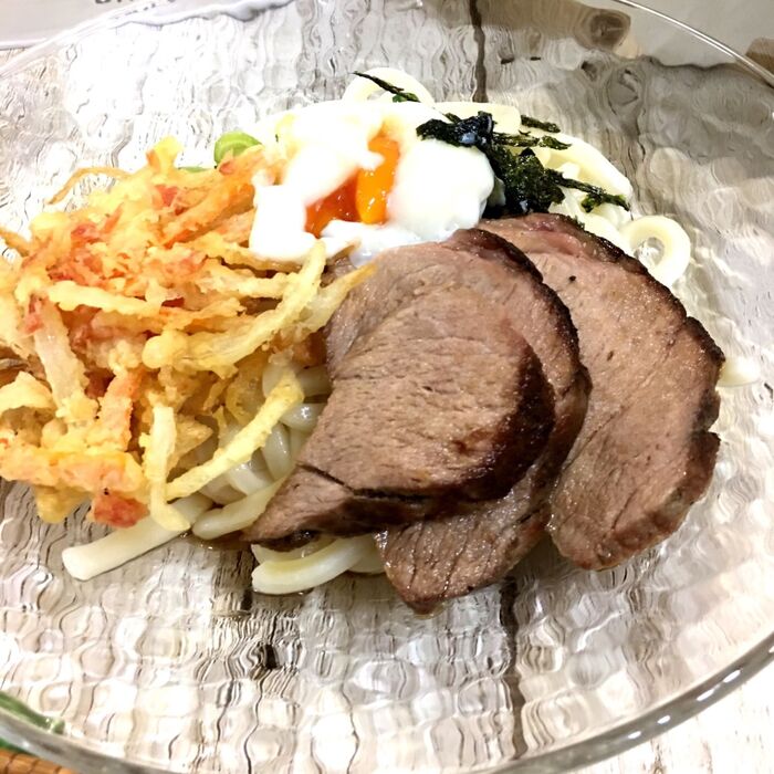冷やし焼豚&かき揚げうどん♡