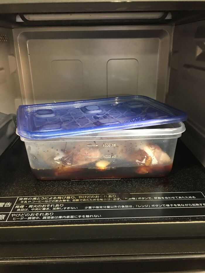 蓋をずらして、600Wで10分UPし、お肉をひっくり返し追加で5分UPすれば完成!