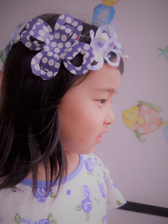 紐にテープでお花をつけて、頭にぐるりと巻いたら完成~!