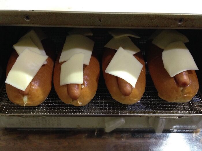 ⑤④にとろけるスライスチーズを千切ってのせ、1000Wのオーブンで2分半~3分焼いてできあがり。