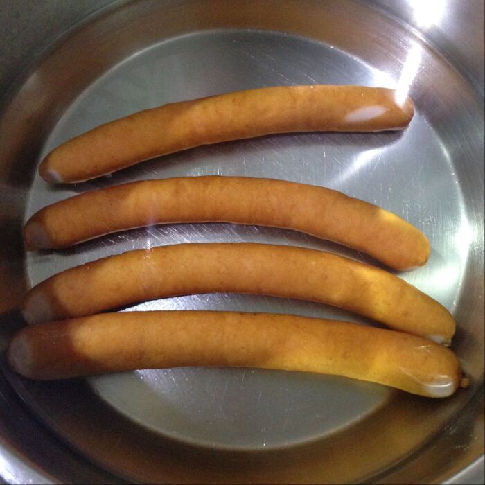 ③鍋にお湯を沸かしてウィンナーを入れ、3分くらい茹でて皿にとり、粗熱が取れるまで冷まします。