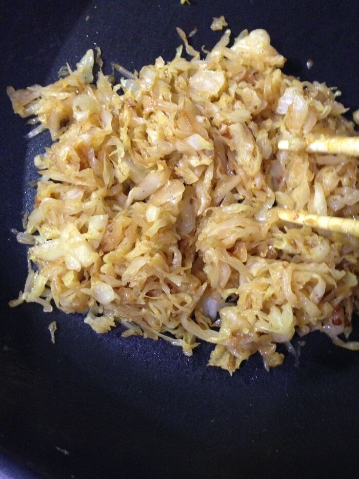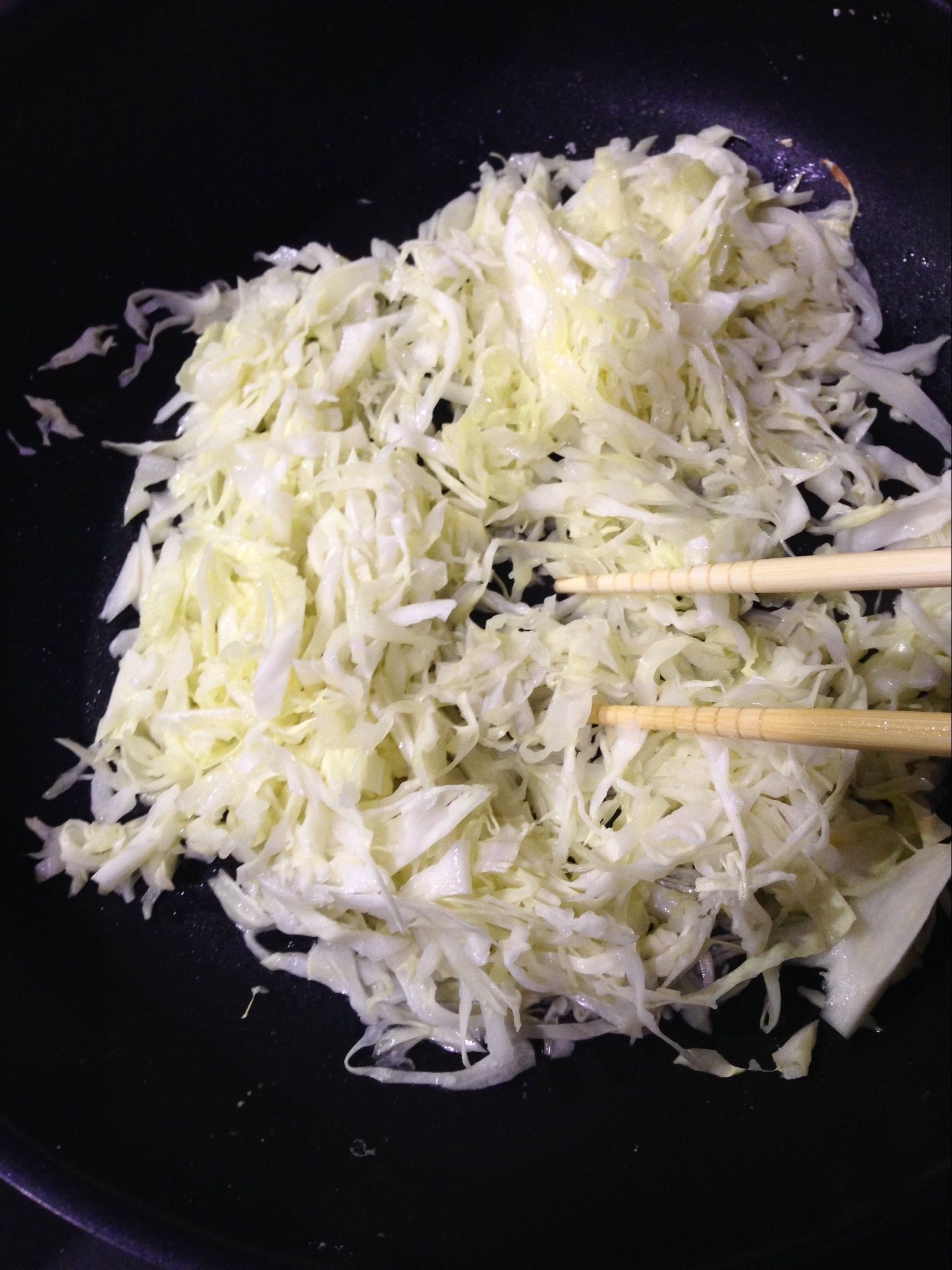 ①キャベツは千切りにします。フライパンにオリーブオイルをしいてキャベツを入れ、塩少々をふって、しんなりするまで中火で炒めます。
