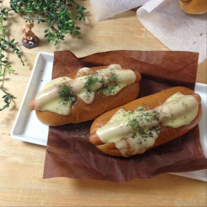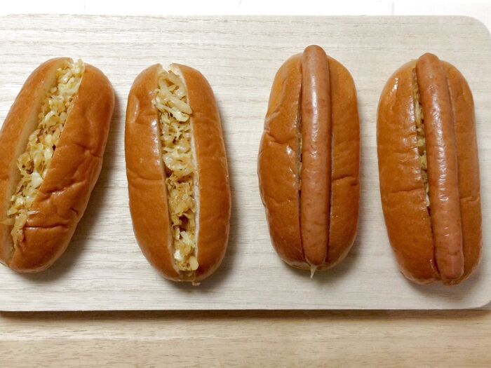 ④パンに切り込みを入れてバターを塗り、キャベツ→ウィンナーの順にのせます。