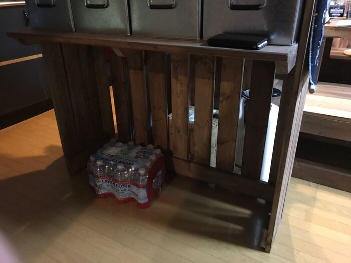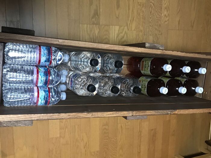 キャスター付きの箱には飲み物のストックを?