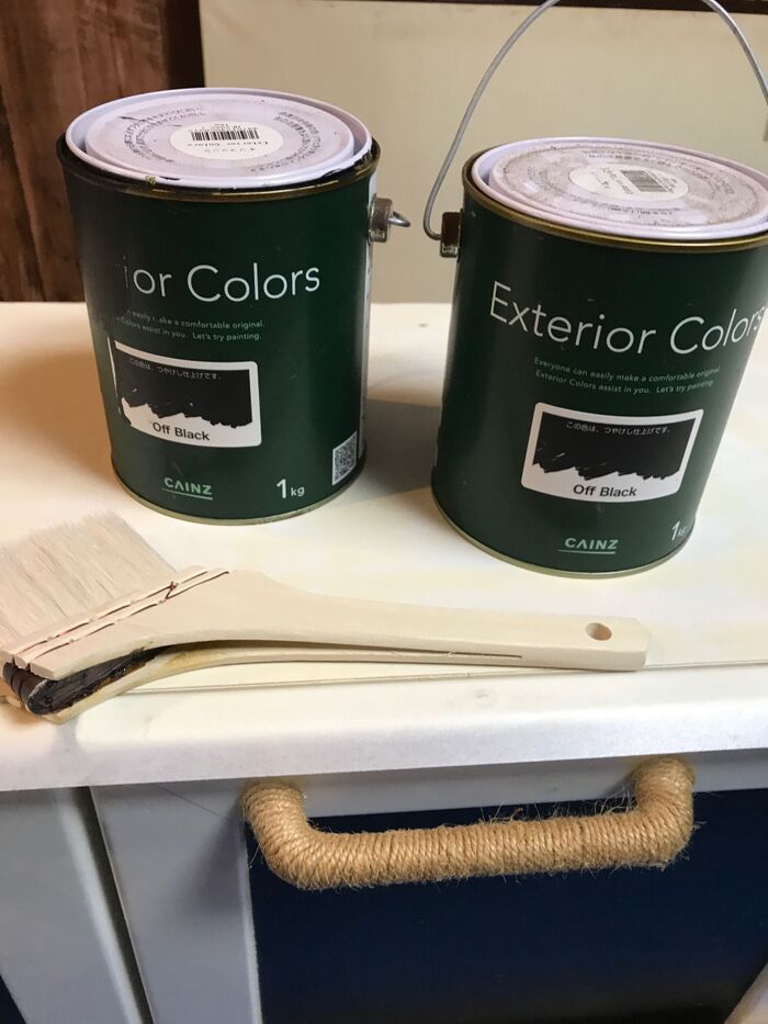 まずは食器棚が黄ばんでいるので正面以外の5面を黒に塗ります。