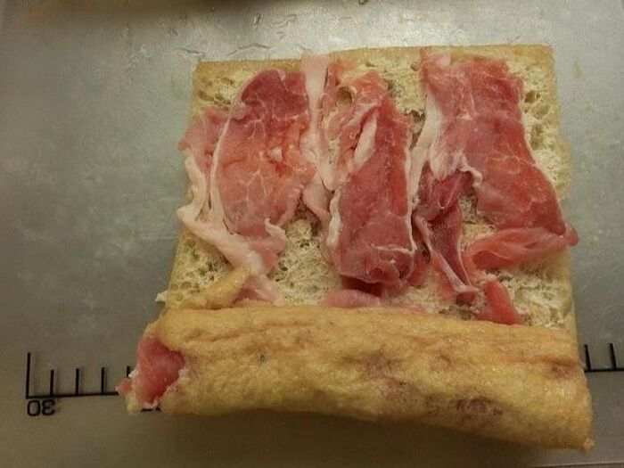 油揚げの3辺を切り開きます。豚肉を上に並べてくるくる巻き、巻き終わりを楊枝で止めます。