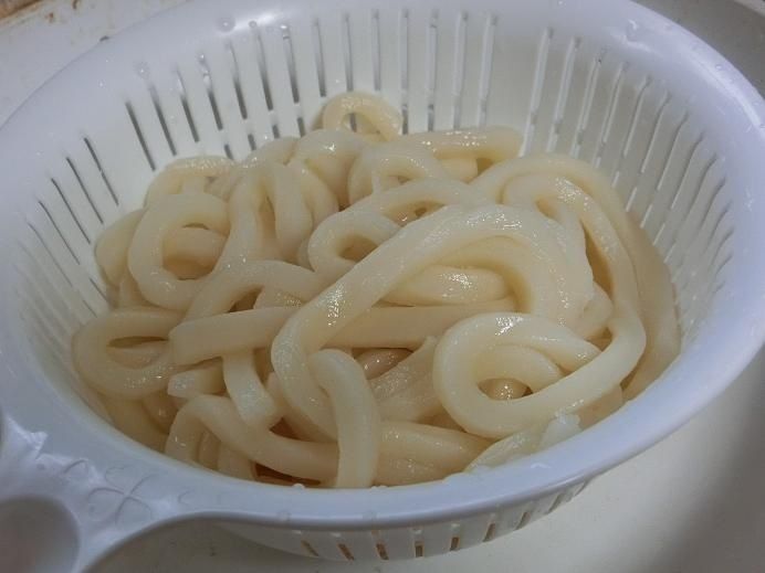 うどんは熱湯で2分くらい茹でます。冷水でしめて水気をしっかりきっておきます。