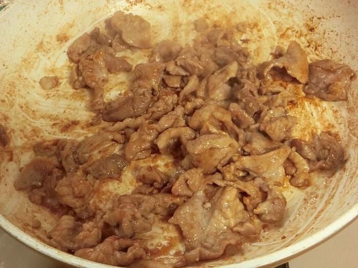 フライパンに油と豚肉を入れて炒め、色が変わってきたら焼き肉のタレ(大さじ1)で味付けします。
