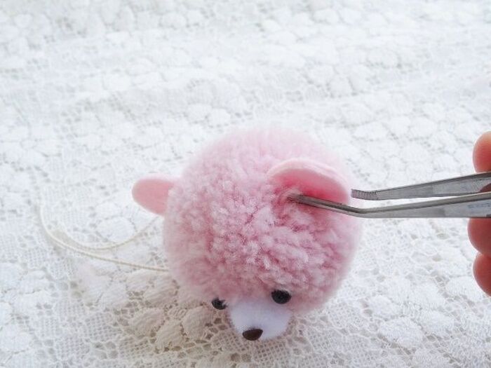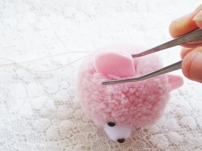 ボンドをつけて挿しこんだ後、周囲の毛糸を元に戻し、耳と一緒にピンセットで軽くつまんでボンドをなじませます。