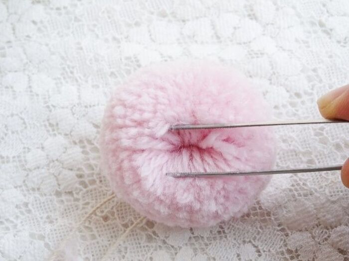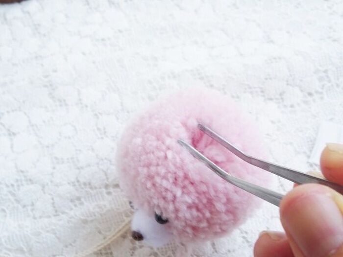 ピンセットをつかってポンポンの毛糸を根元から広げ、ぼん天を仮置きします。