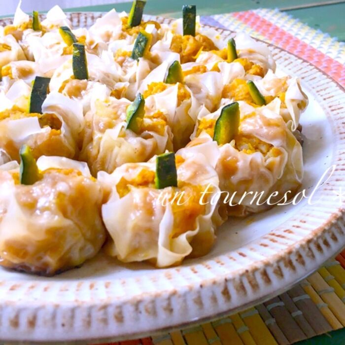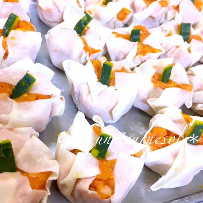 親指と人差し指で輪を作って、そこにシューマイの皮をのせて、中心に③のタネを入れて皮を少し抑えながら形を整え、中心にかぼちゃの皮をさす。