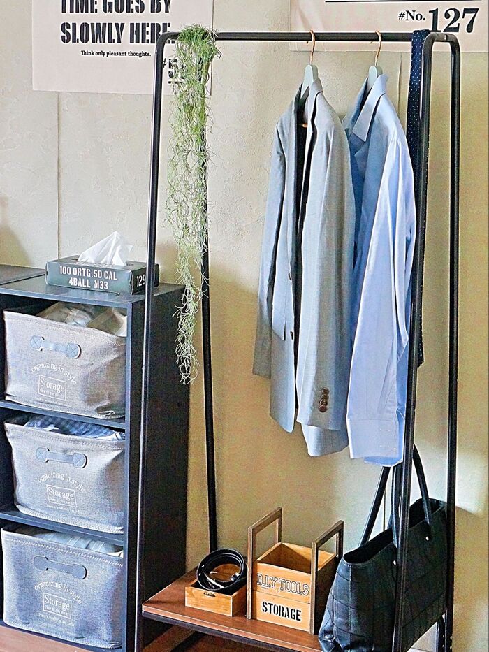 横に並べているのもアイリスオーヤマさんのカラーボックス。これが黒だったので、ハンガーラックも黒にしてみました。