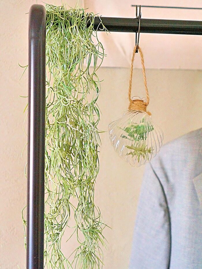 フェイクグリーンをポール部分にかけて、片方は100均の、ガラスの貝殻の形をした入れ物に小さいフェイクグリーンを入れた物をフックでぶら下げています。