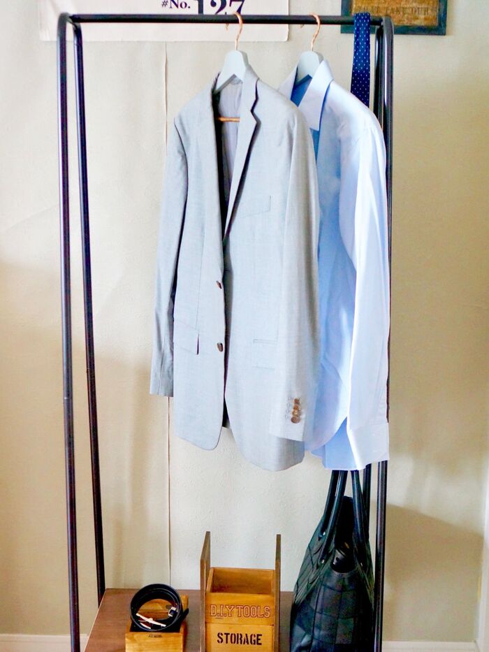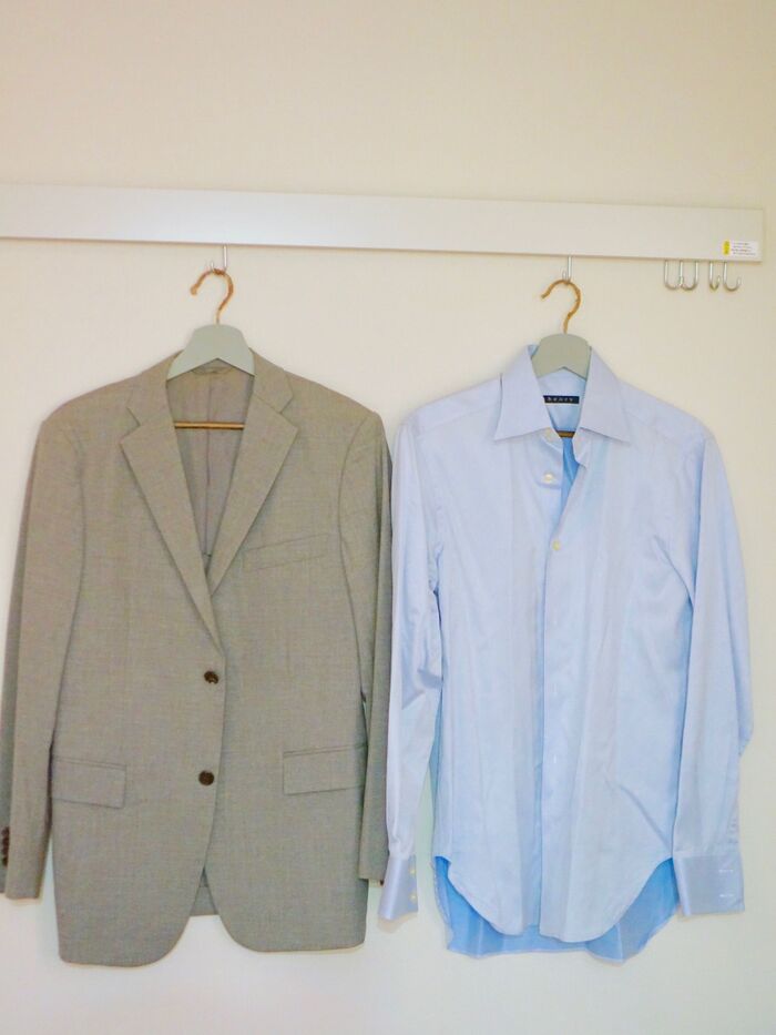 実際に服を掛けてみました。ただのいつものジャケットもシャツも上品に見える気すらします(笑)