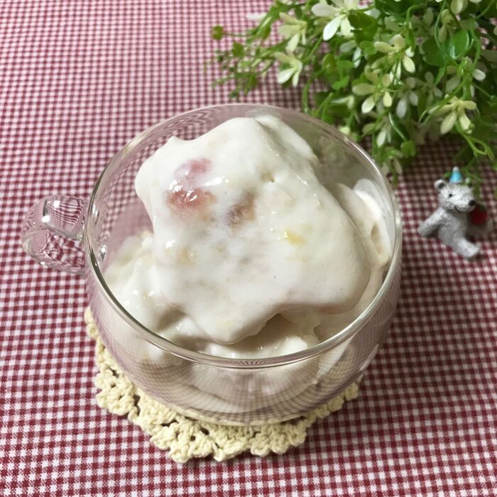 ⑤1時間後に冷凍庫から取り出し全体をよくかき混ぜ、更に30分毎に全体をよくかき混ぜ、2時間くらい冷やし固めてできあがり。