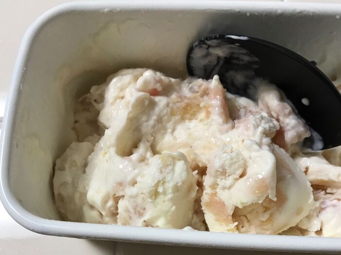 ④桃を加え、果肉を潰すように混ぜ合わせて容器に入れ、冷凍庫に入れます。