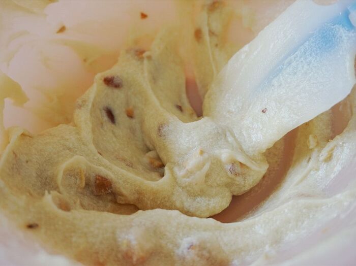 バターを常温にしてクリーム状にし白あん、コンデンスミルク、豆乳を加えて混ぜて良く混ざったらナッツを加えます。