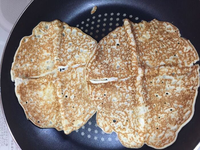 ③お皿にパンケーキを広げて乗せ→サラダ→ゆで卵・コーン・ベーコンなどをトッピングしたら、ドレッシング回しかけて出来上がりです。