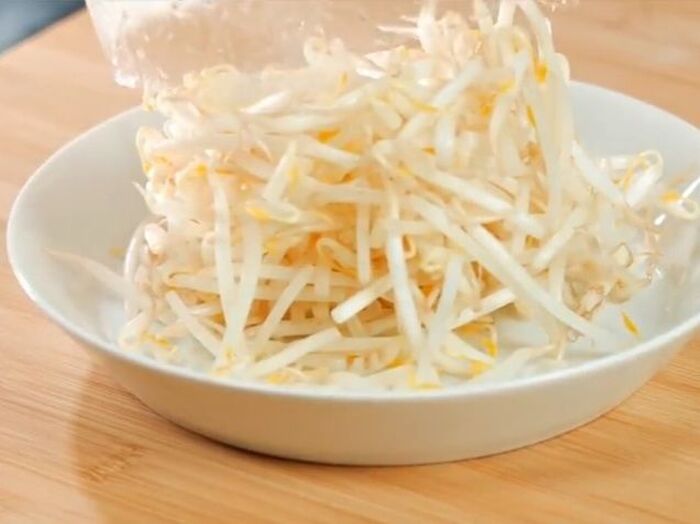 もやしの袋の上部をハサミで切り、水を7分目位まで入れます。