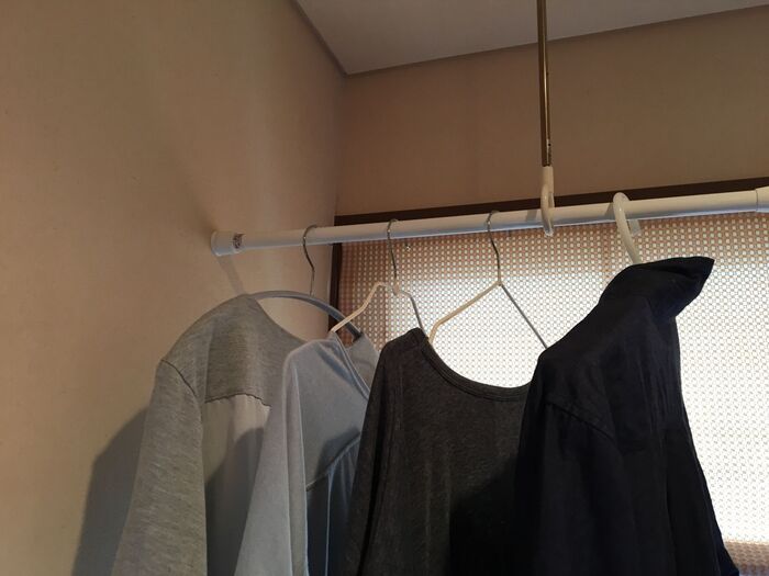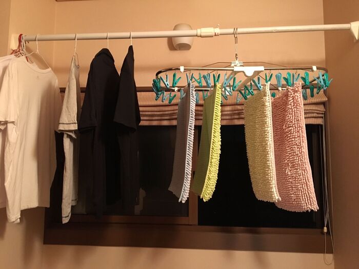 この場所が主な洗濯干し場で、天井式物干しだけだと干せる物に限界もあるので物干し竿を通してましたが、つっぱり棒にした事で、万が一の落下防止にもなってます。