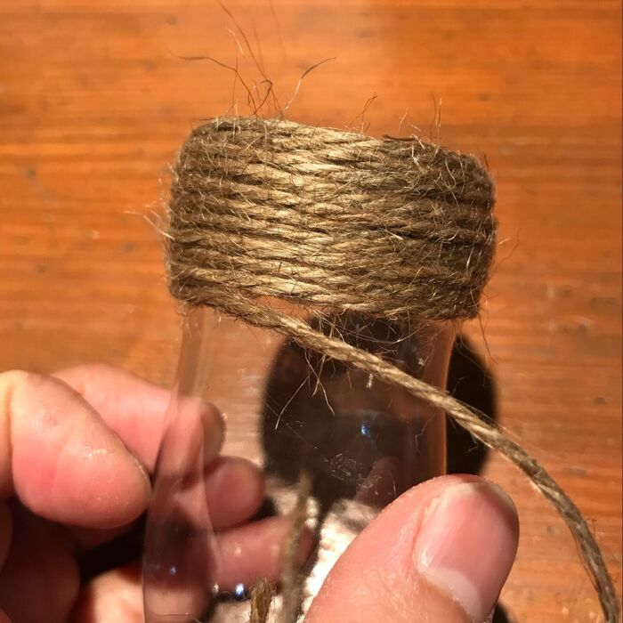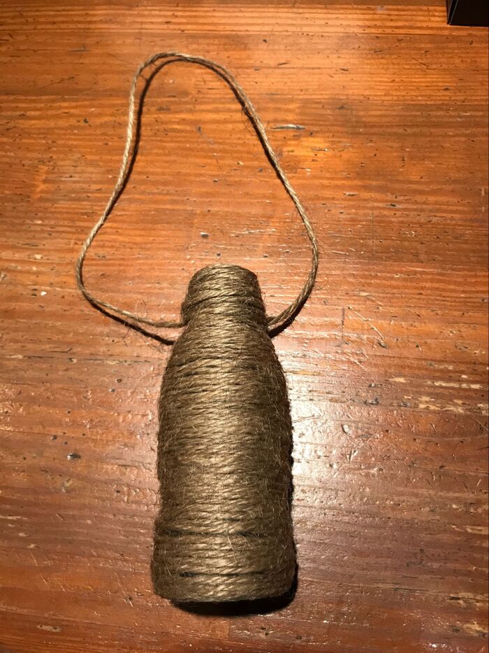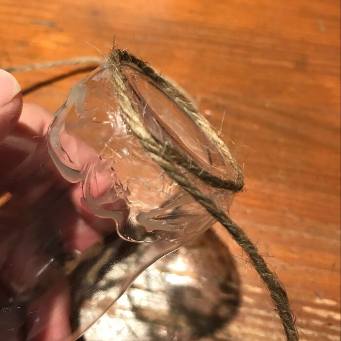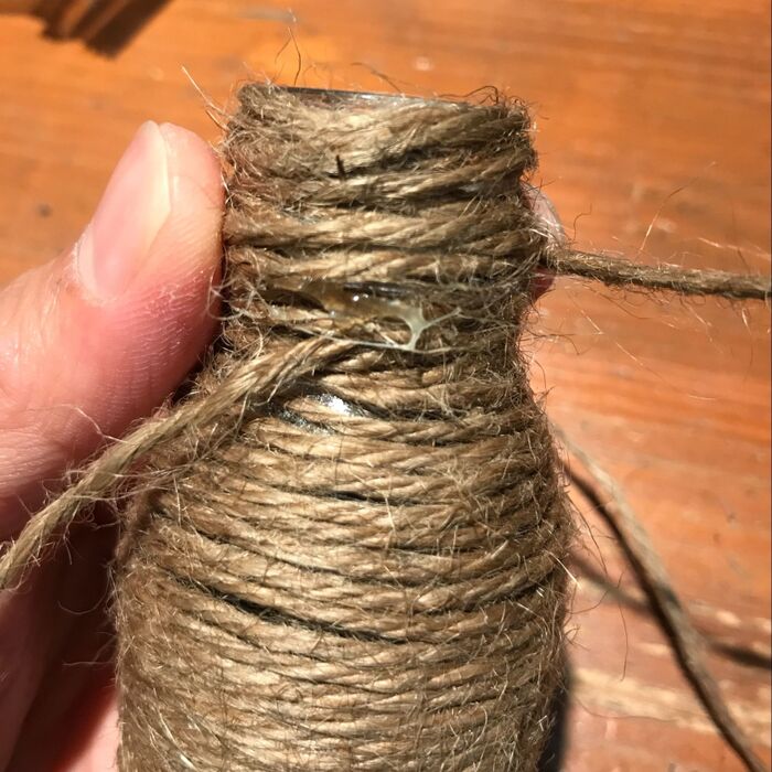ペットボトルを吊るすための麻紐を適当な長さに切り、ボンドで接着します。