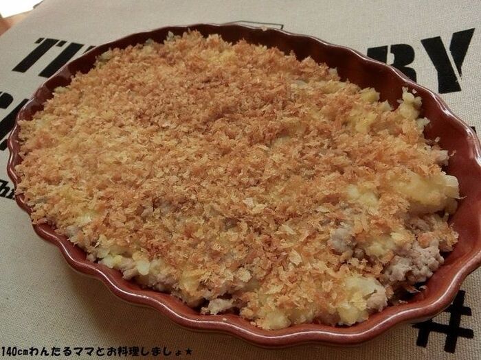 容器にカレー、ジャガ芋の順に平らに入れ、パン粉を広げたら完成♪