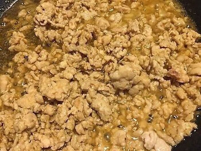 フライパンにサラダオイル小さじ1を入れ 鶏ひき肉とすりおろしたしょうがを入れ炒め 日本酒と焼き鳥のたれで味をつけ汁けがなくなるまで炒める
