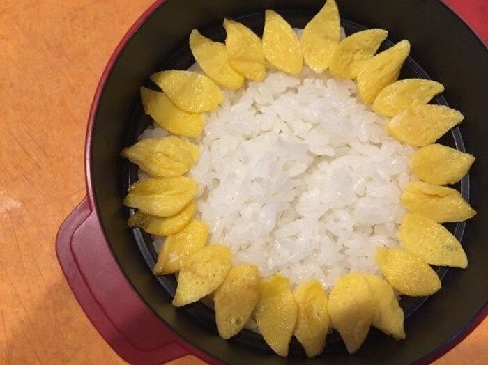 弁当箱にご飯を盛り花びらを外側からならべていく