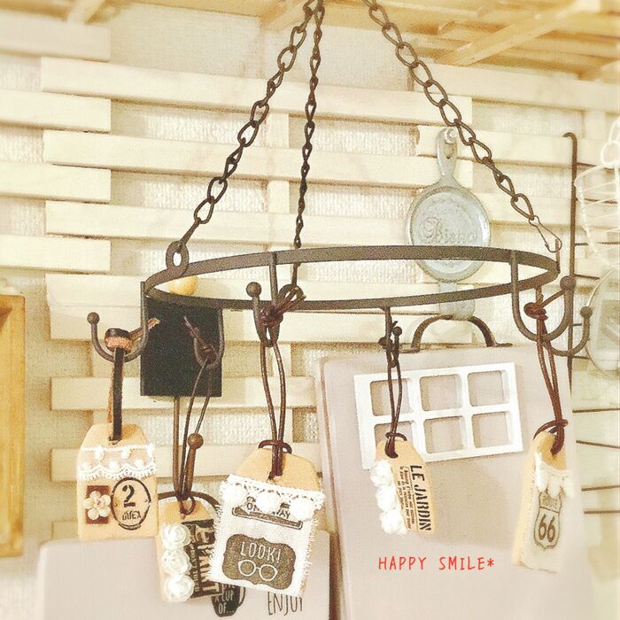 レースや造花、リボン、革、転写シールなどで飾ります。木工ボンドで貼ります。