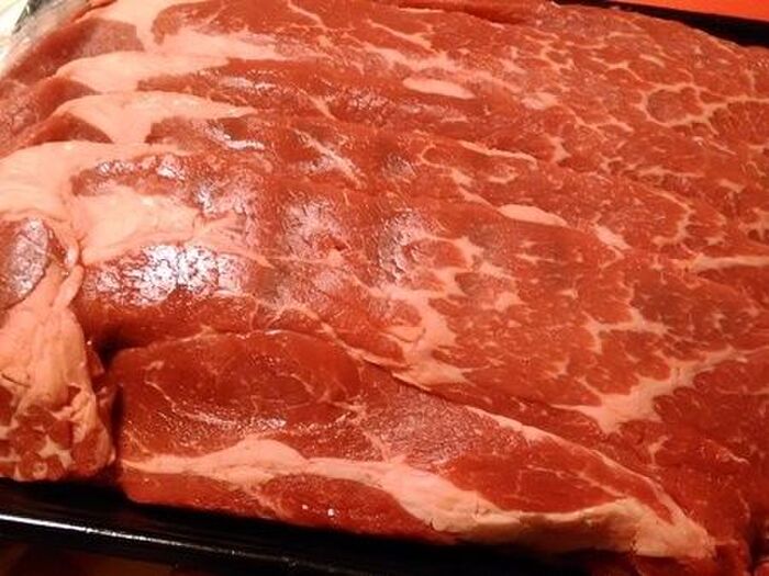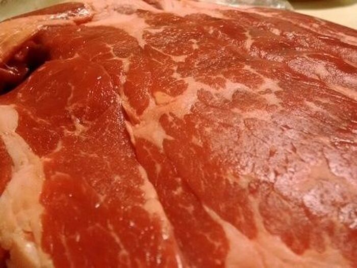 お肉に近づいて見てみると、和牛のように霜降りになっている訳ではなくて、赤身中心のお肉です。