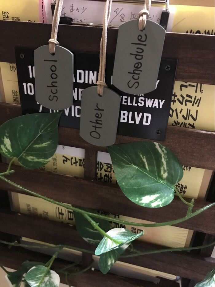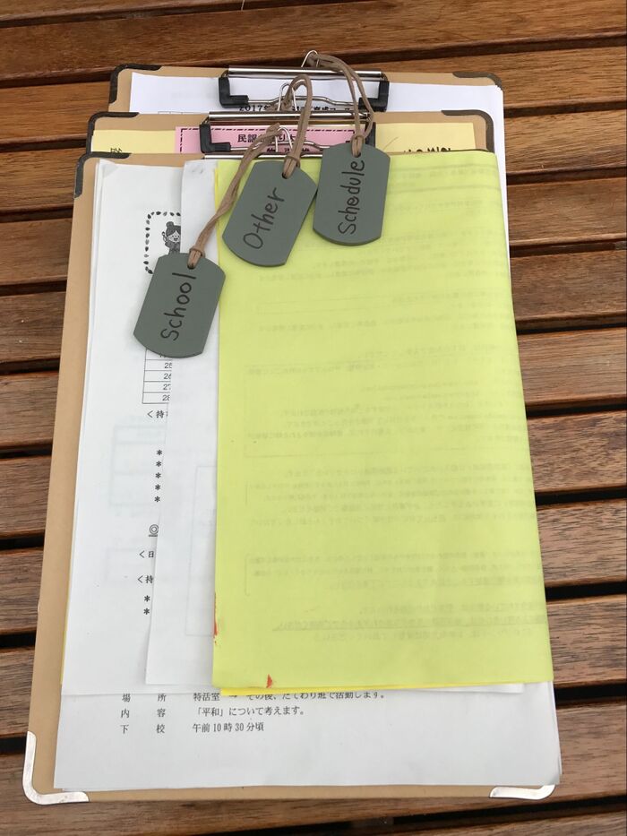 それぞれプレートにschool、schedule、otherと用途別に記載しているので、見たいプレートを引っ張れば簡単にクリップボードが取り出せプリントを見ることができます。またその場で見るだけでなく持ち運びもできるのでいろんな場所でプリントを見ることができます。入れるだけなので収納も簡単にできます。