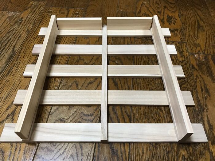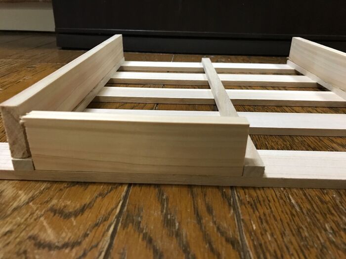 先程切った角材をすのこの両端の下駄にそれぞれボンドで接着します。