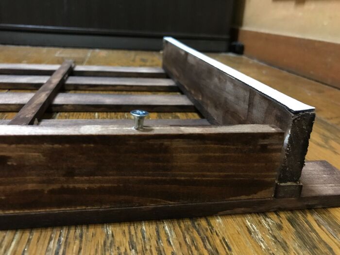 短い角材を付けた部分が両端の下駄の上に付けた角材の高さより低い為、木ネジを短い角材のそれぞれ真ん中に締めます。この時、下駄上の角材と高さが揃うようにします。(写真参照)