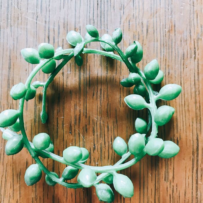 2. グリーンネックレスで直径5㎝ぐらいの輪っかを作り白いリース台にワイヤーで固定します。