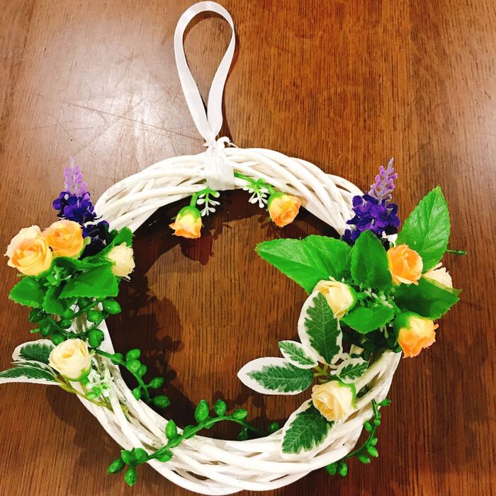 6.リースのあいているところに1つのローズと葉を差し込みます。