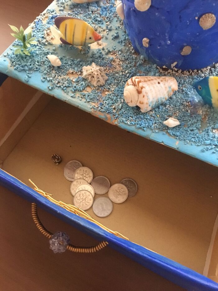 空き箱の上部、百均の貯金箱をのせる部分は百均の貯金箱の底より小さい穴をくり抜きます。