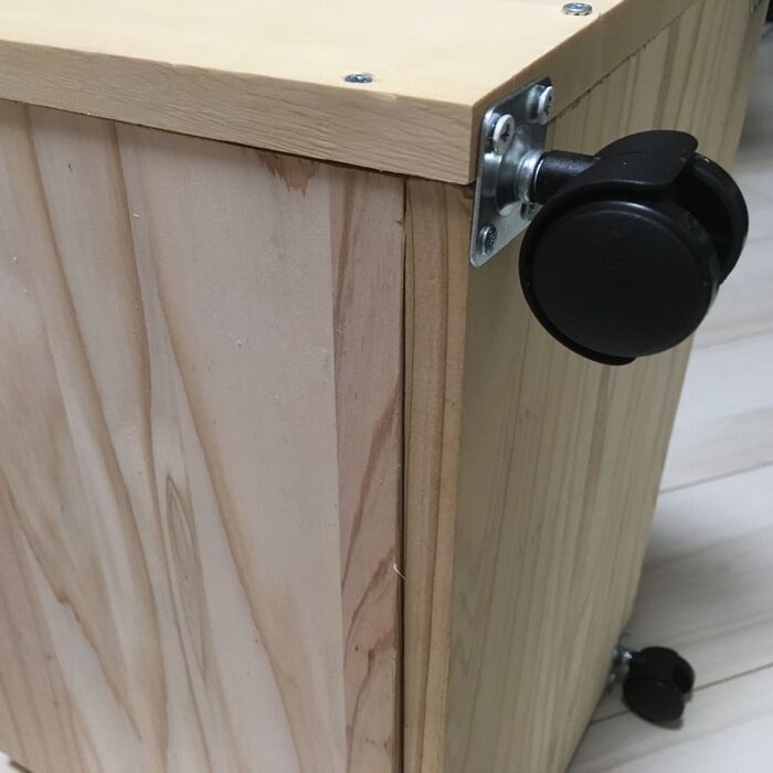 上の天板と中の収納ケースの縁部分を引っ掛けていた受けの部分を取り外します。