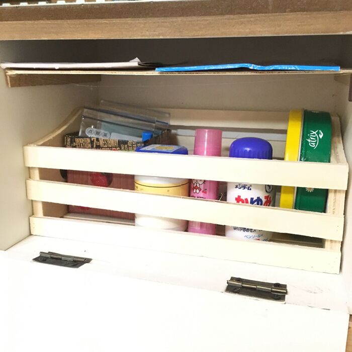 以前作った棚など。そこには、次に使う頻度が高い、キズグスリや絆創膏、ミニ裁縫道具、爪切りや体温計などを入れています。