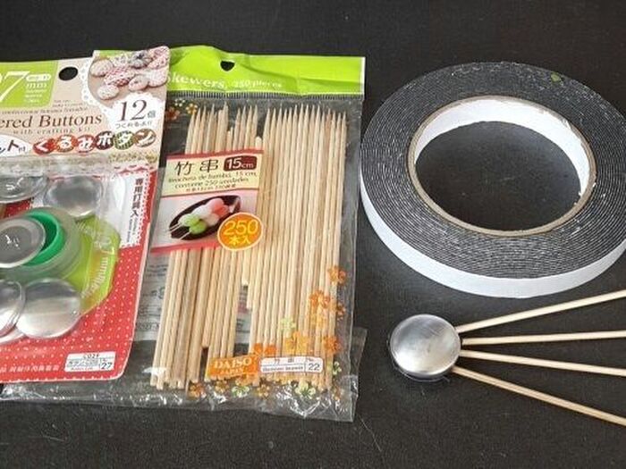 ⑤ ボタンの金具に両面テープを貼って竹串を固定する。