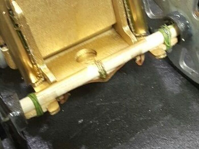 ② 本体に車軸を両端2cm出す様にアレンジワイヤーで縛り木工ボンドで固定する。