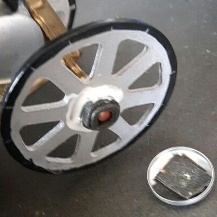 ③ 車軸の両端に両面テープを車輪の口径に合わせて巻き付ける。