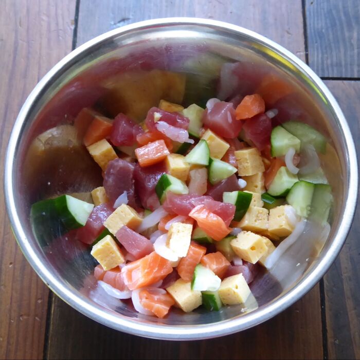 1、具材は全て1センチ弱の大きさにカットし、和えます。