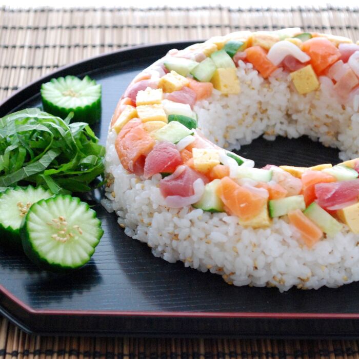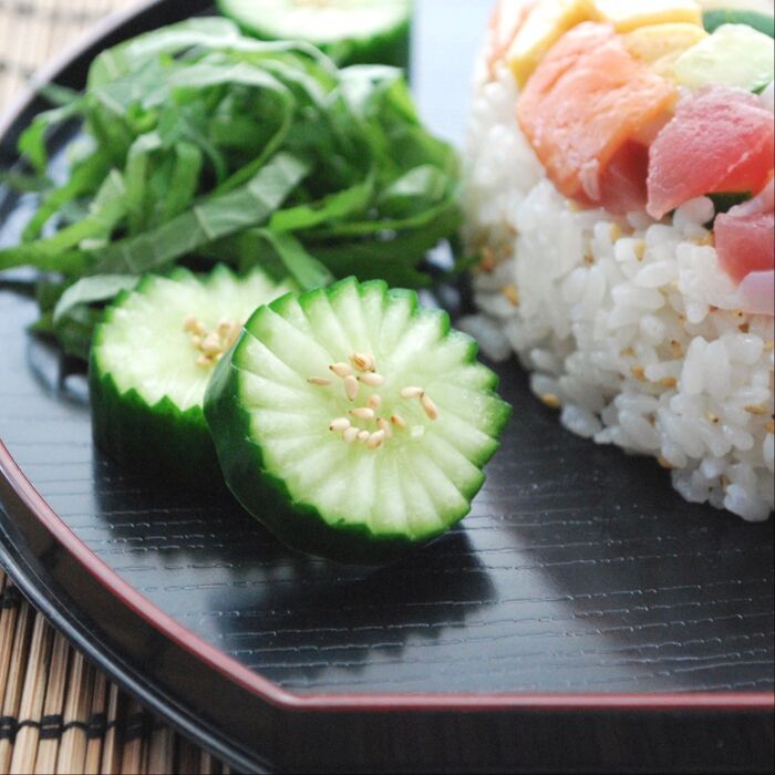 6、きゅうりなど、野菜の飾り切りを一緒に盛り付けると、ぐっと華やかになりますよ!