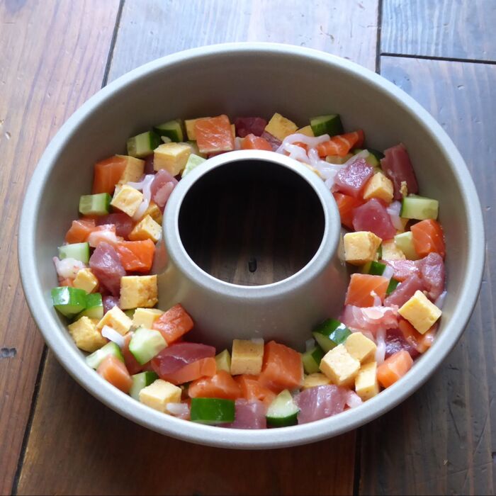 4、2の上にご飯を詰め、冷蔵庫で10分ほど冷まします。