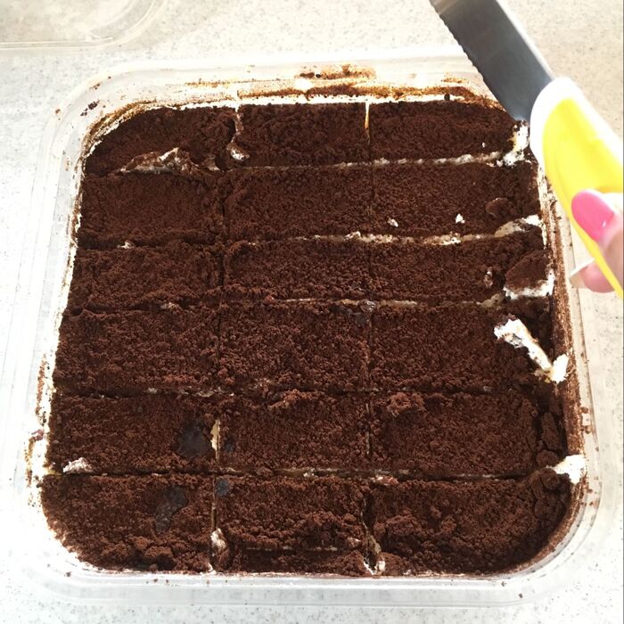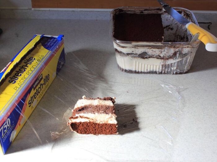 容器ごとカットする方もいらっしゃいますが、私はいつも容器は切らずにスプーンとナイフでティラミスを挟んで掘り起こしながら一切れずつラップにくるんでいます。