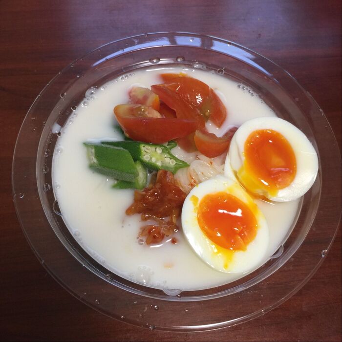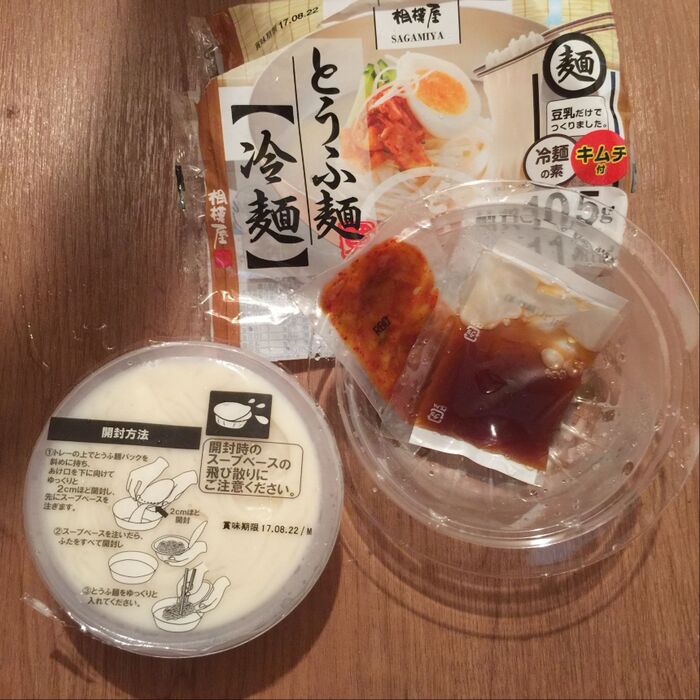 とうふ麺(豆乳で麺が見えない)とスープ、キムチが入っています。キムチを別で買わなくてもいいので、とても嬉しい。キムチは使いきれずに残ってしまう時があるので、一食分にしてあるのは親切です。少し辛めのキムチが豆乳と合わさってとてもまろやかな味に変わります。