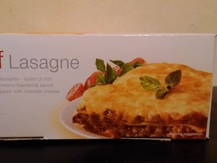 原材料名:トマトピューレ、パスタ(強力小麦粉)、牛乳、牛肉、クリーム、玉ねぎ、にんじん、チーズ、赤ワイン、小麦粉、マーガリン、食塩、植物油、大豆タンパク、砂糖、香辛料、パン酵母抽出物、増粘剤(加工でん粉)、調味料(核酸)、pH調整剤、カラメル色素、保存料(ソルビン酸(K))