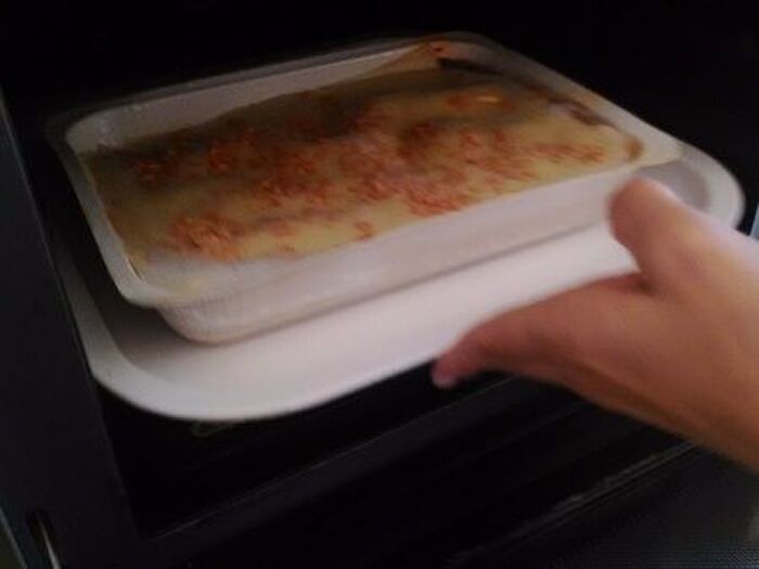 オーブンを200度に予熱しておいて、ビーフラザニアの容器についている薄いフィルムをはがしてオーブンに投入します。