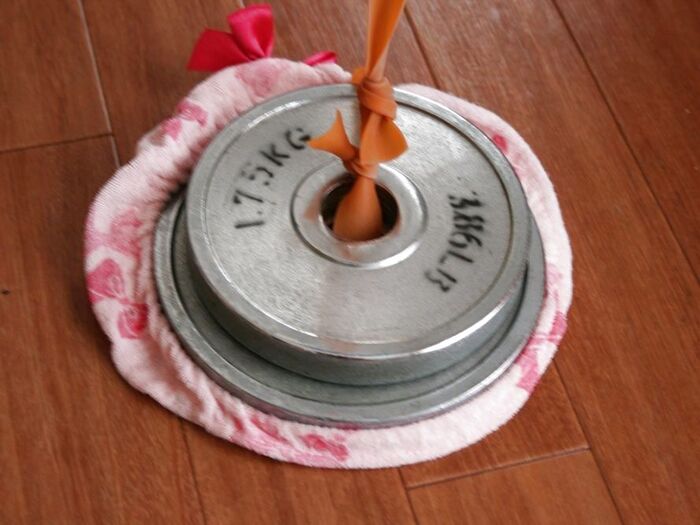 ダンベルの重りにつまずいたり、蹴ったりしたら怪我をするので娘のヘアバンドをまいてみました!